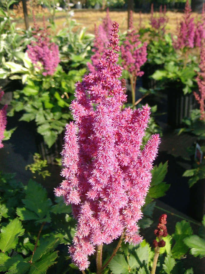 Астильба Арендса Pumila — многолетнее декоративноцветущее растение с плотными малиново-розовыми соцветиями ромбической формы. Образует кустики высотой 15-20 см с прямостоячими стеблями, на которых в августе появляются пышные метельчатые соцветия. Листья ярко-зеленые, имеют сложную форму с зубчатыми краями. <br>