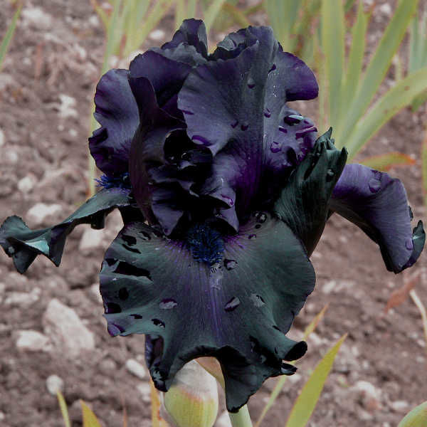 Ирис Ghost Train практически черный с идеальной формой и гофрировкой. Высокие, стройные цветоносы.3-4 цветоноса по 7-11 бутонов на каждом. Высота цветоноса 94 см. Срок цветения средний.