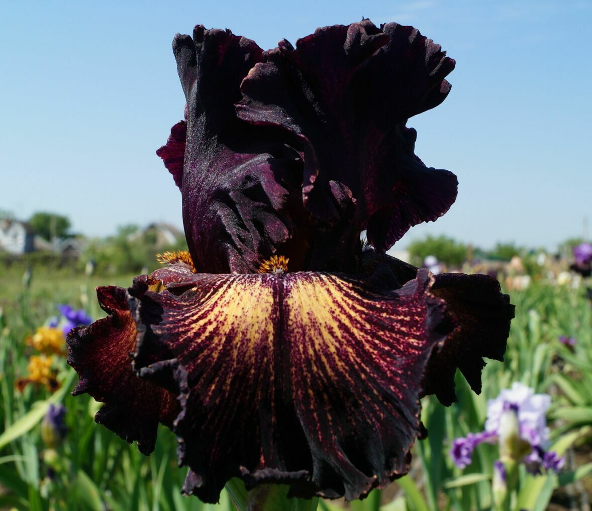Рассада ириса Drama Queen достигает в высоту 100 см. На высоких прочных цветоносах красуются темно-фиолетовые кружевные соцветия. Нижние доли (фолы) сочетают в себе персиковые и темно-фиолетовые оттенки, которые проникают друг в друга. Темно-фиолетовый цвет окончательно побеждает на кайме и в центральной широкой полосе. Верхние доли (стандарты) - черно-фиолетовые, густо-окрашенные, сильно гофрированные. Бородки - желто-фиолетовые, незаметные. Цветение раннее. Аромат приятный.