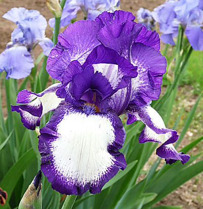 Stepping Out обладает яркой, контрастно-чернильно-фиолетовой пликатой на белом фоне. Бородка желтая в гороле и синяя к краю. Лепестки слегка гофрированные, плотные, искрящиеся. Срок цветения поздний.