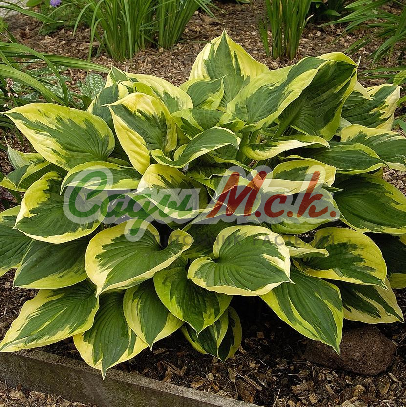 Хоста гибридная Бэнд ов Голд - большая хоста, которая разрастается в ширину на 75 см. Листья размером 25х21 см, в центре с тёмно-зелёным рисунком в форме кленового листа и с золотистой, а затем кремово-белой каймой. Окраска каймы сильно зависит от освещённости. Цветки белые. Высота листьев 50 см, высота цветоносов 60 см.