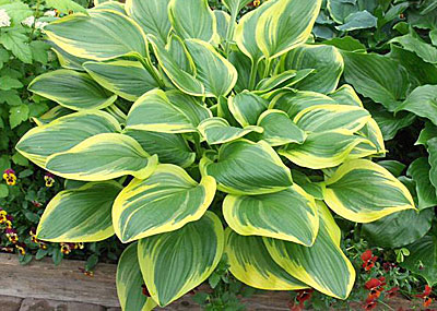 Хоста Bill Brink – красивое, многолетнее, декоративное растение с густой и пышной листвой. Его яркие, крупные, блестящие листовые пластины сердцевидной формы близко расположены друг к другу, поэтому образуют плотный, компактный куст высотой до полуметра. На темно-зеленом фоне особенно мило выглядит неравномерная по ширине золотистая кайма. Со временем листва немного закручивается, а ее край меняет окраску, приобретая цвет слоновой кости. В разгар лета растение пышно зацветает, выбрасывая соцветия колокольчатых цветков лавандовой окраски с более темными полосками. Сорт имеет хорошую репутацию быстрорастущего, устойчивого к заболеваниям и неприхотливого растения.